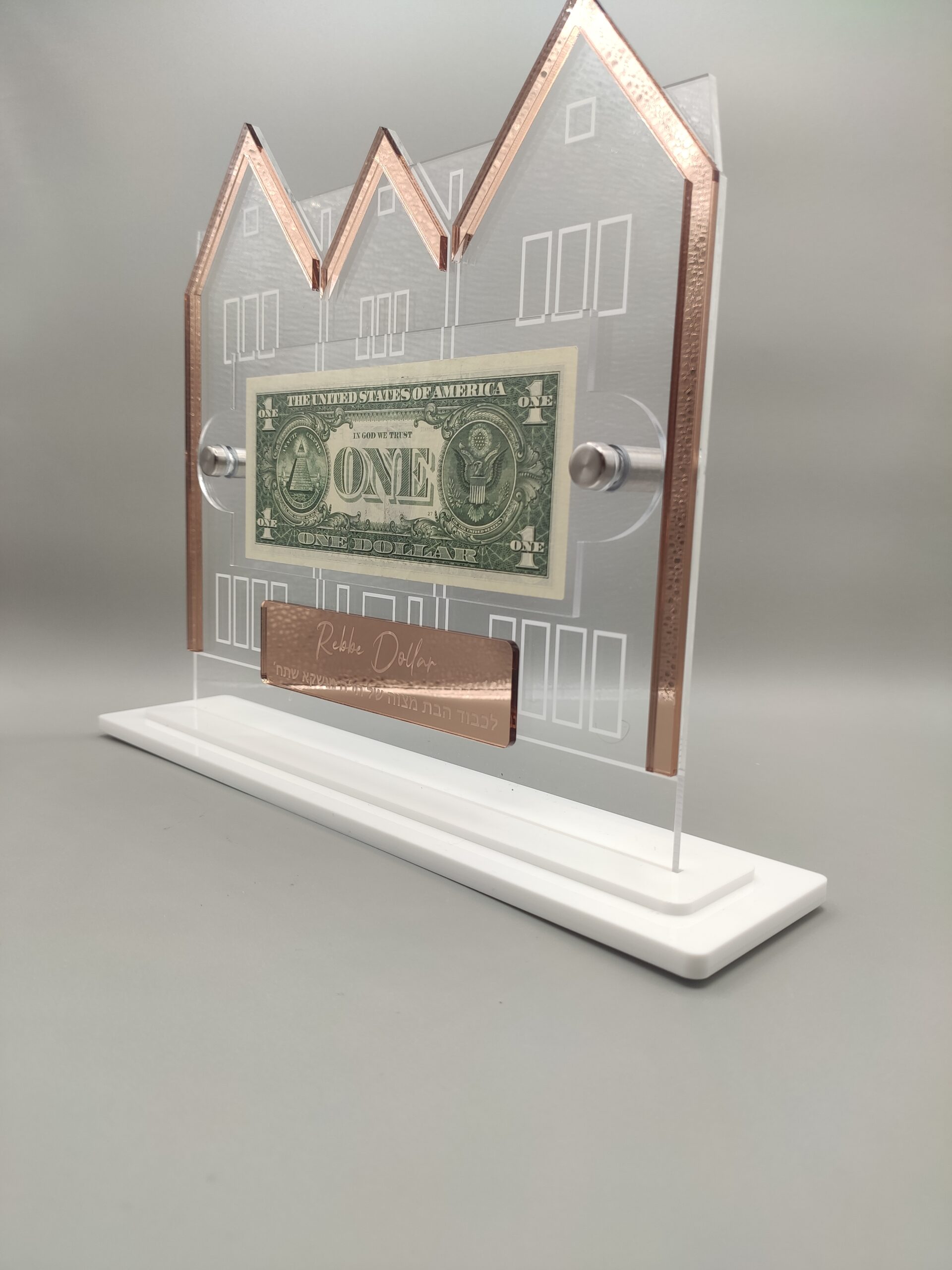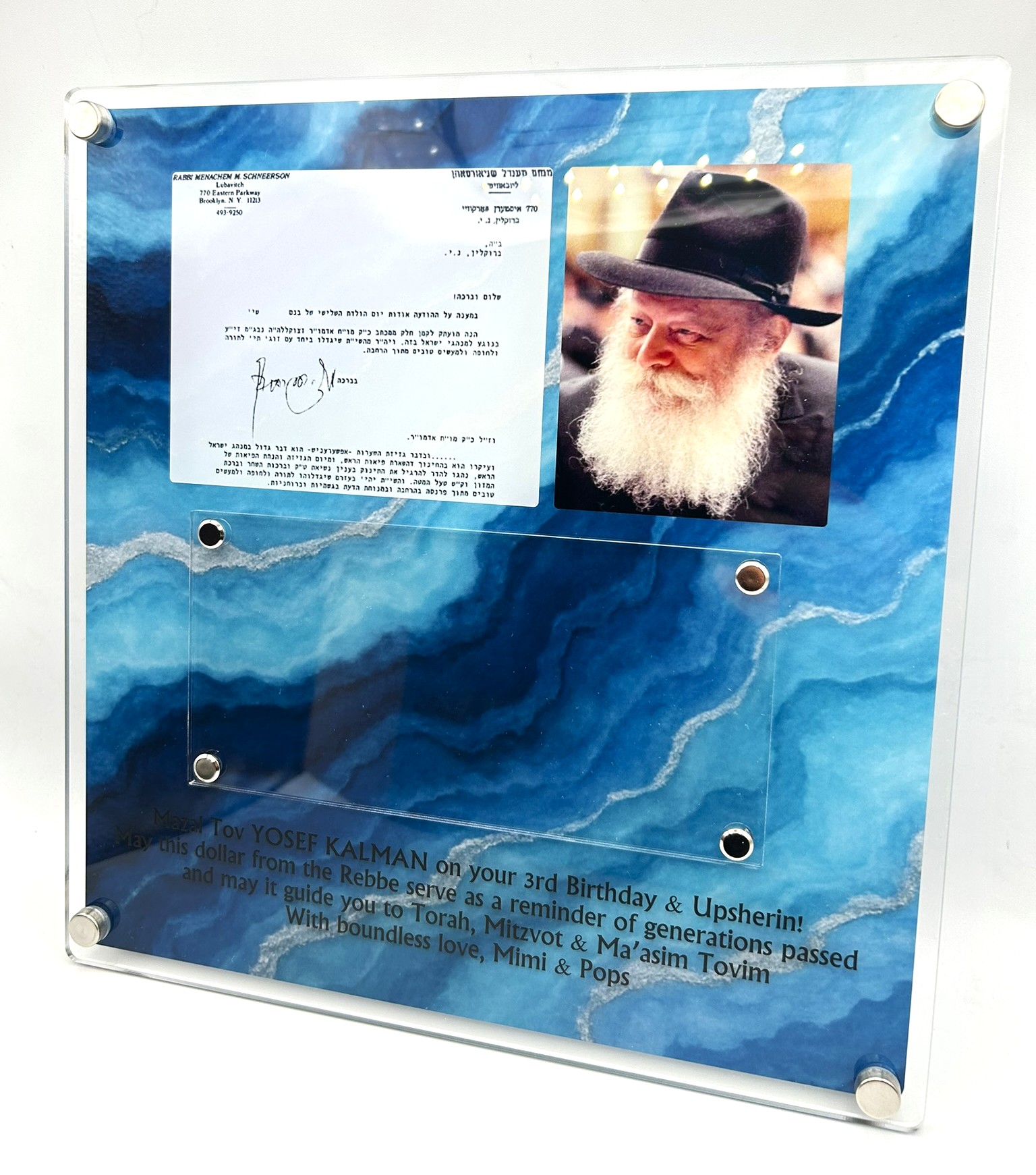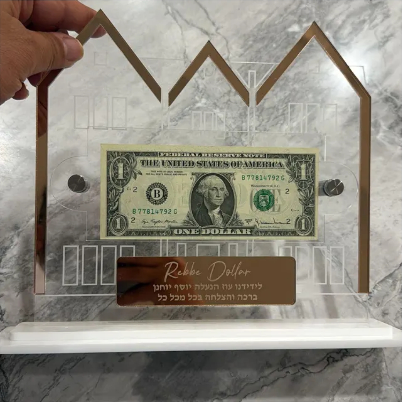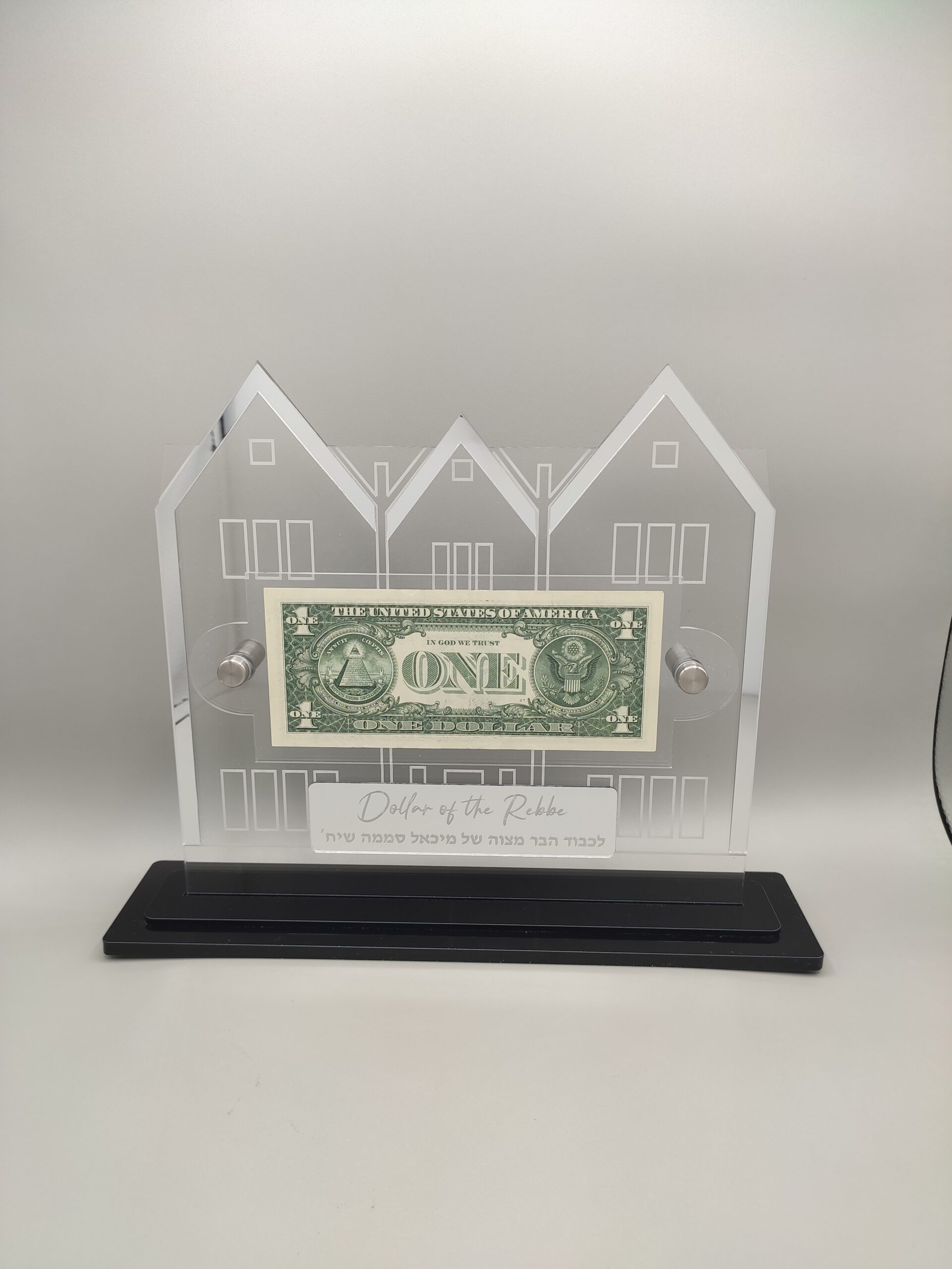 Shipped promptly. Looks just like the pictures and the personalization is such a nice touch. No better way to showcase my Rebbe dollar. Thanks again!