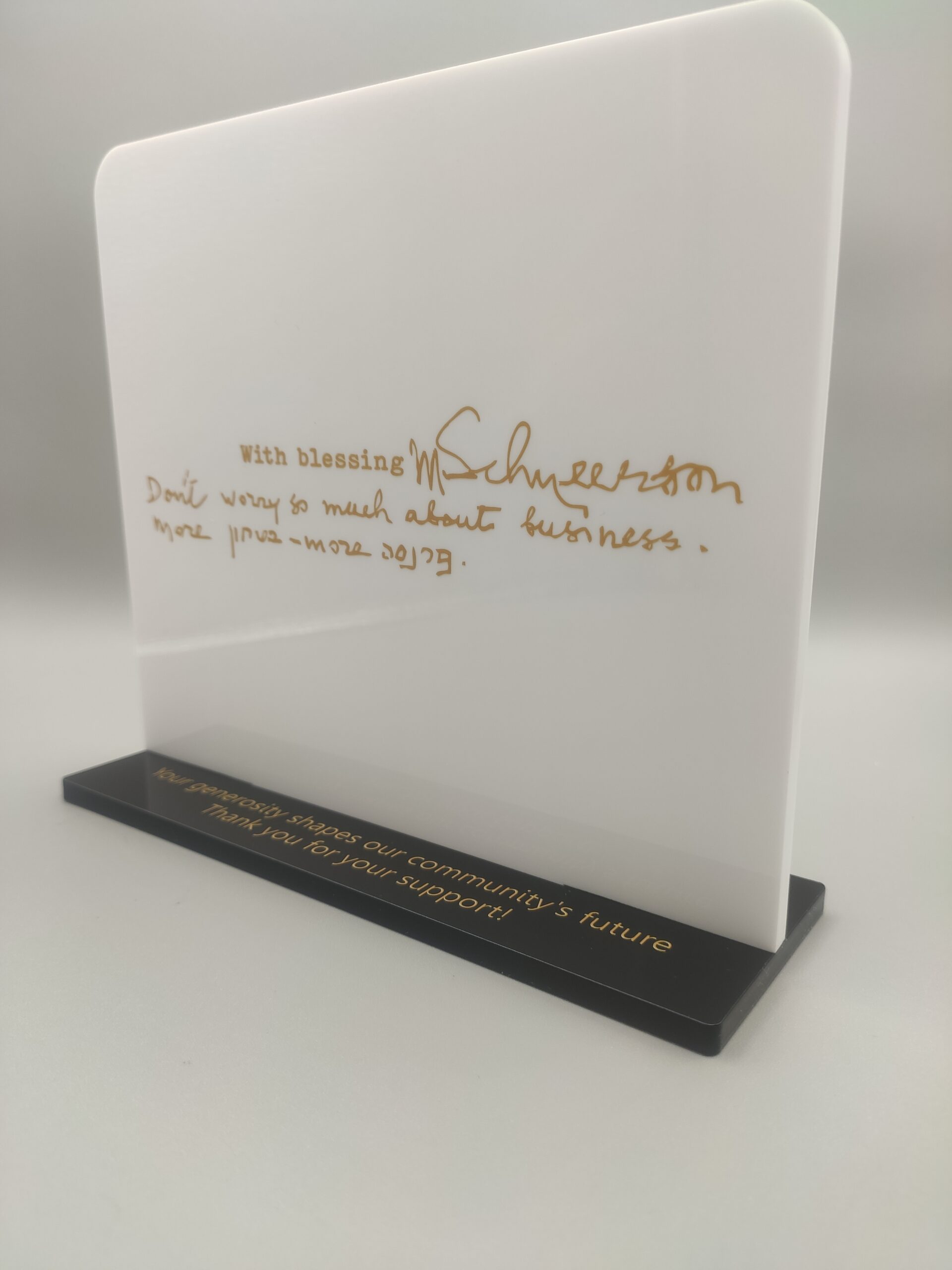 ChaiLuxe is a manufacturer specializing in custom plaques, donor and memorial walls, custom-made awards, signage and lettering for shuls and organizations, as well as unique gifts for donors and the Jewish community.