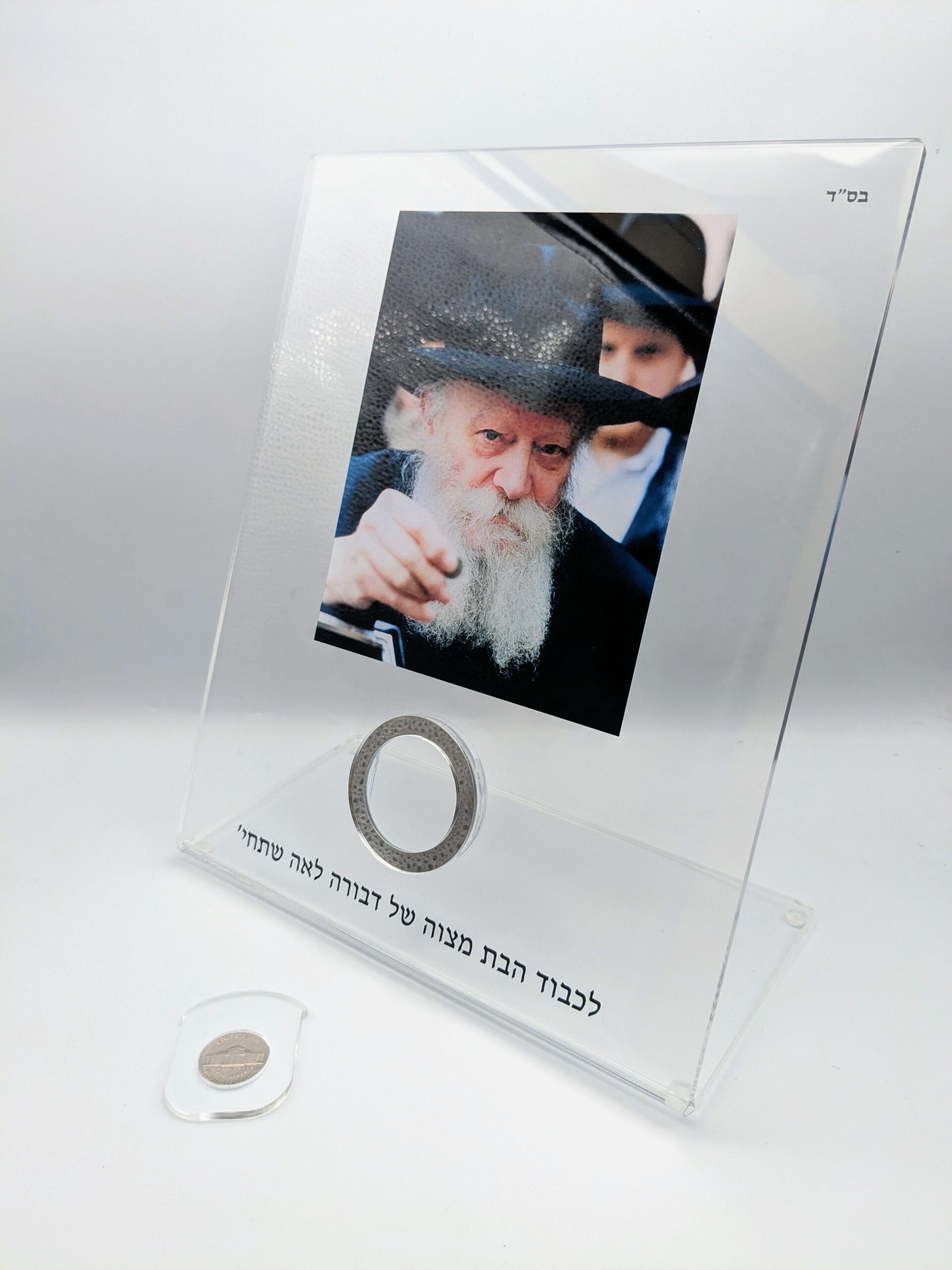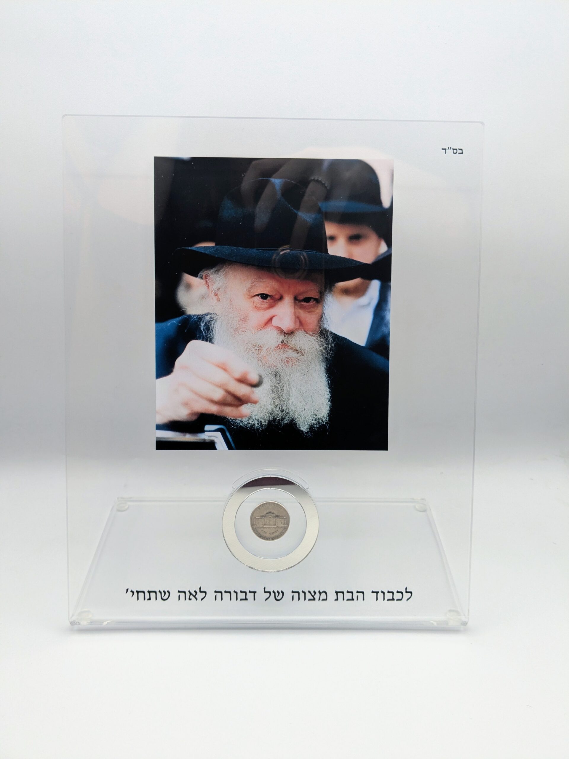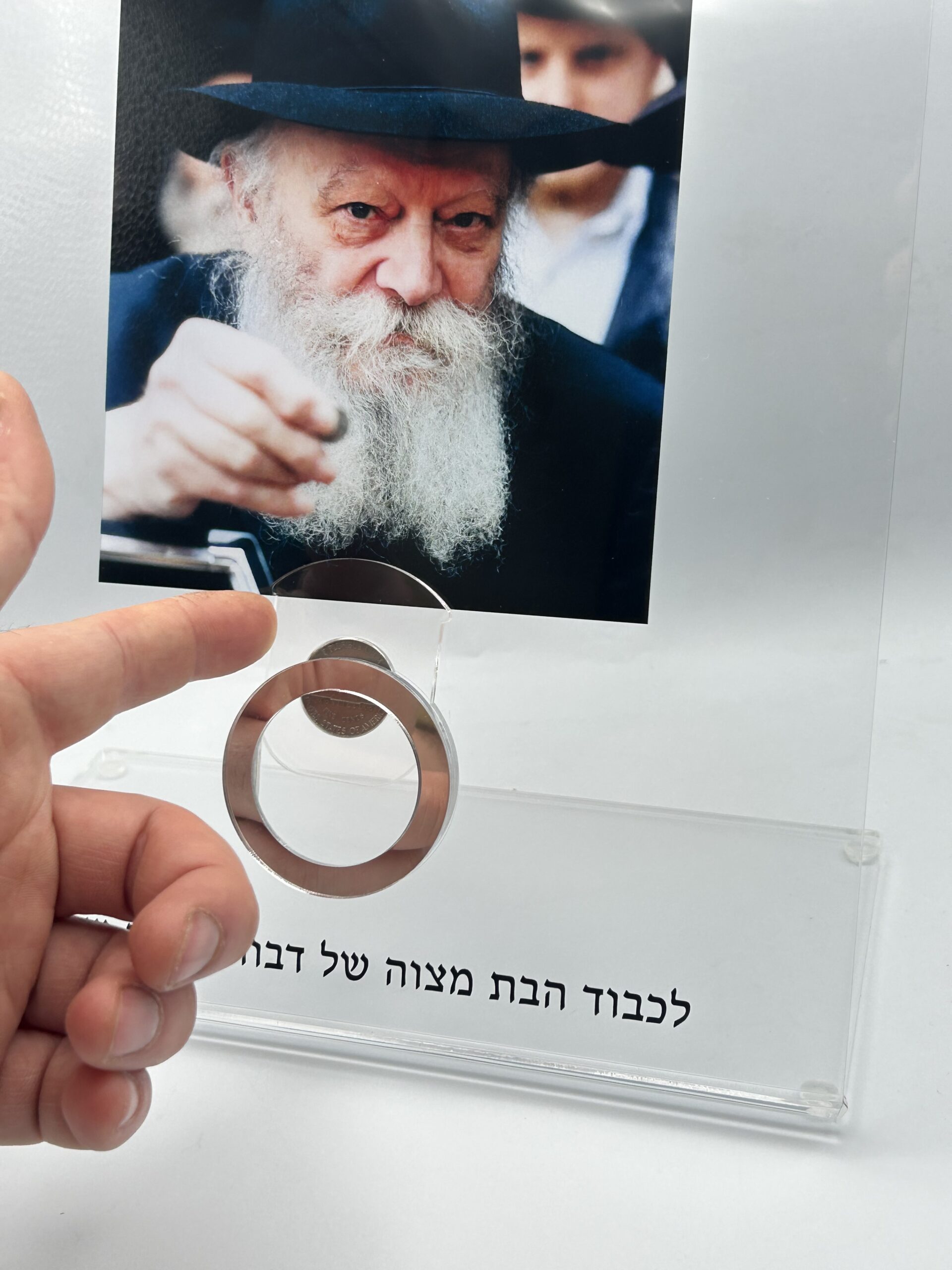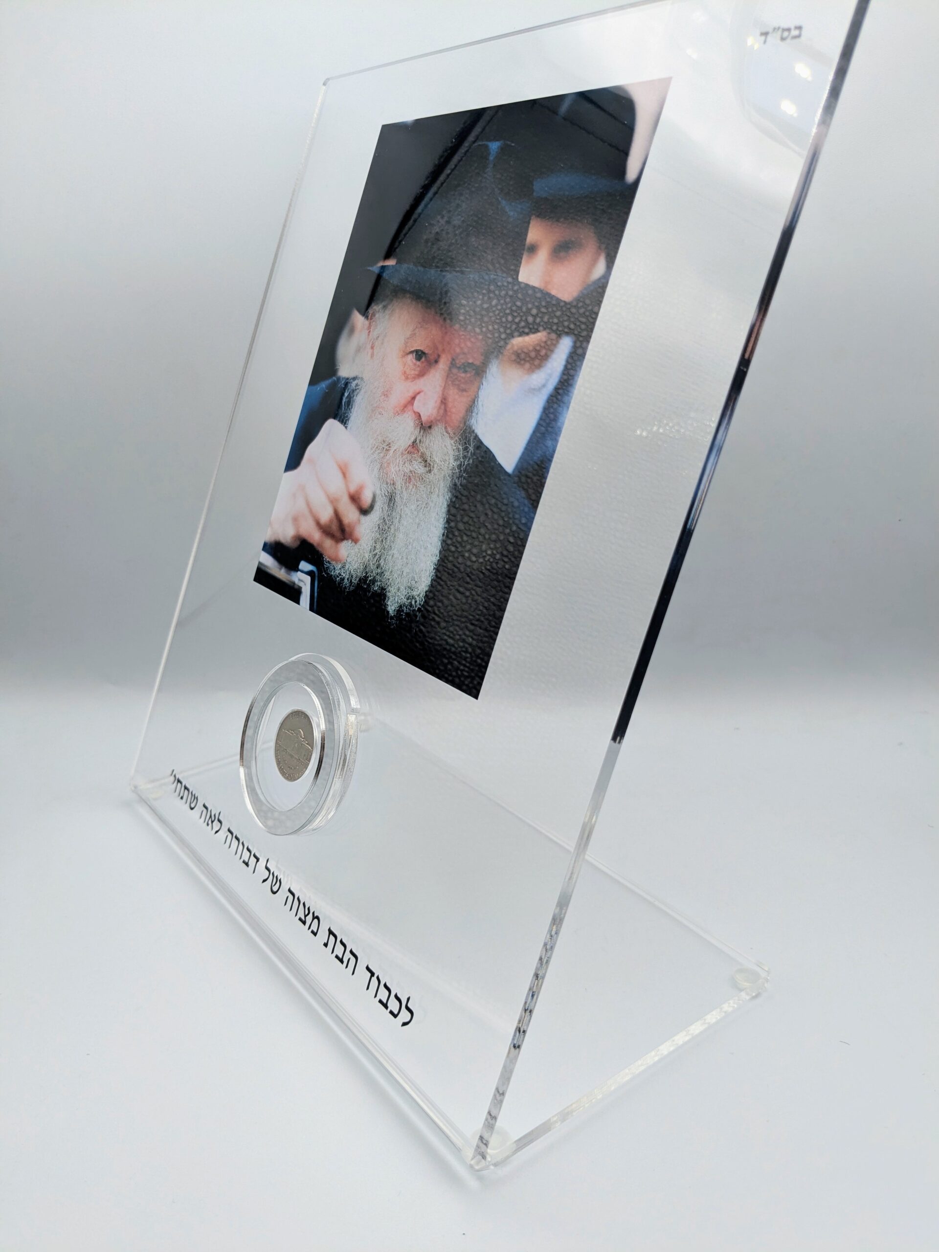 Honor a meaningful moment with this elegant Rebbe coin display, crafted to preserve and showcase a special coin received from the Lubavitcher Rebbe. Featuring a high-resolution photo of the Rebbe giving a coin, this stand captures the essence of connection, inspiration, and blessing.