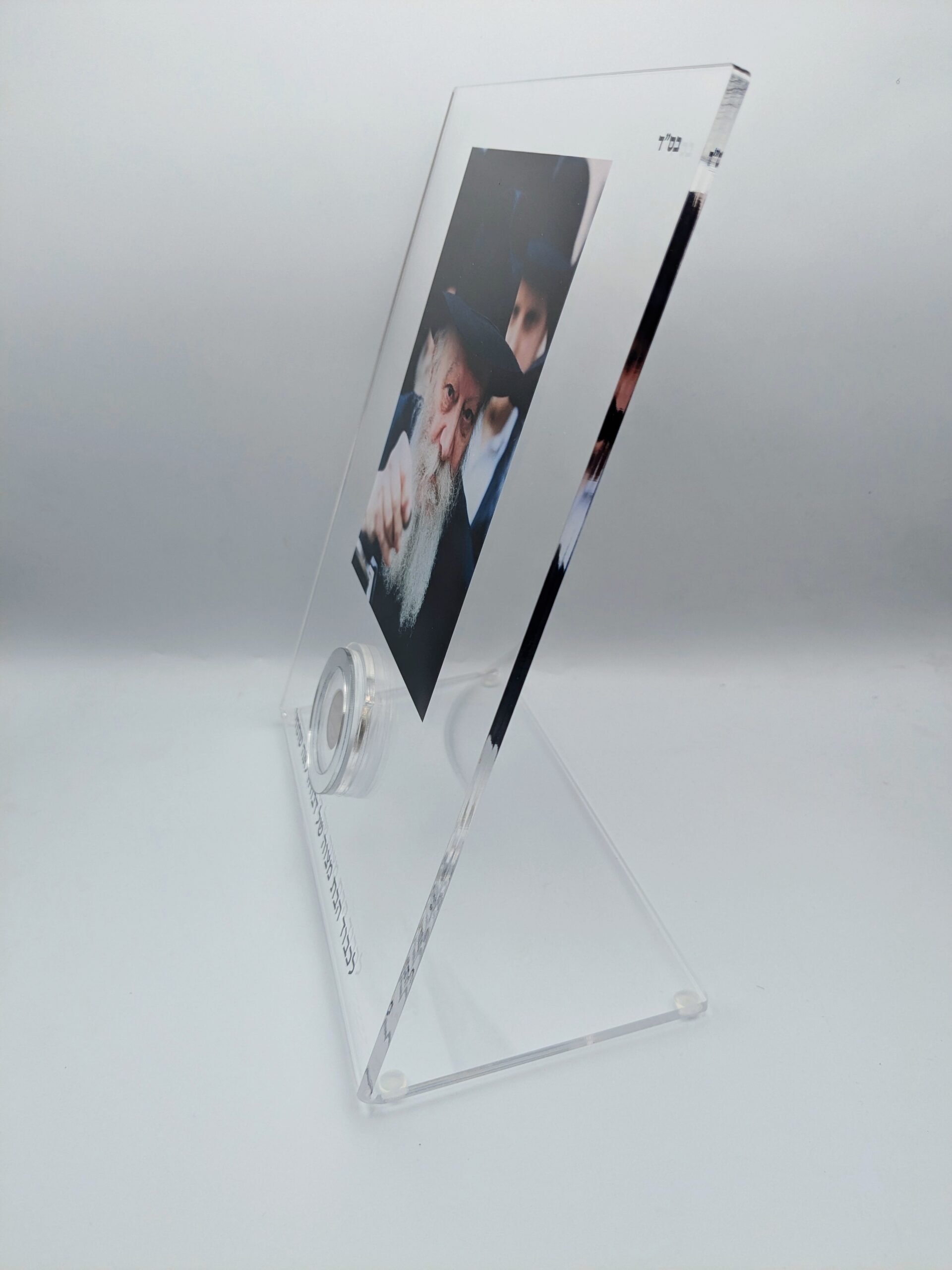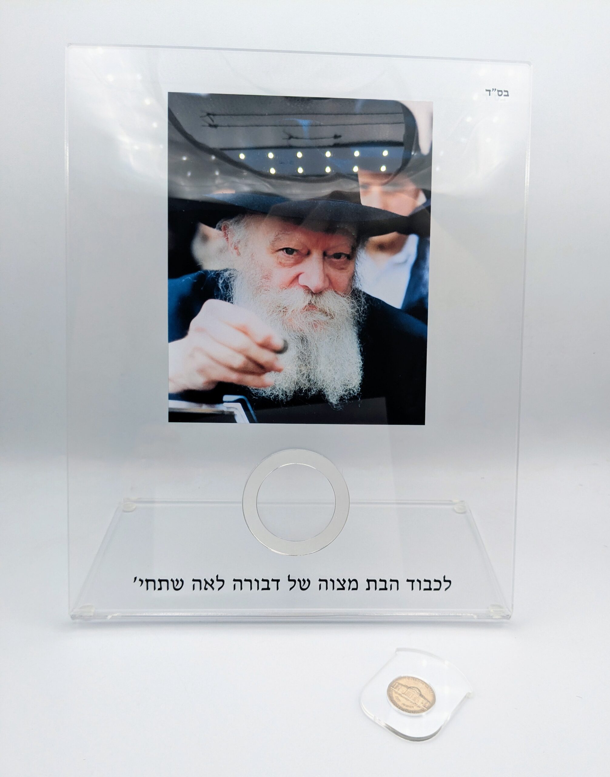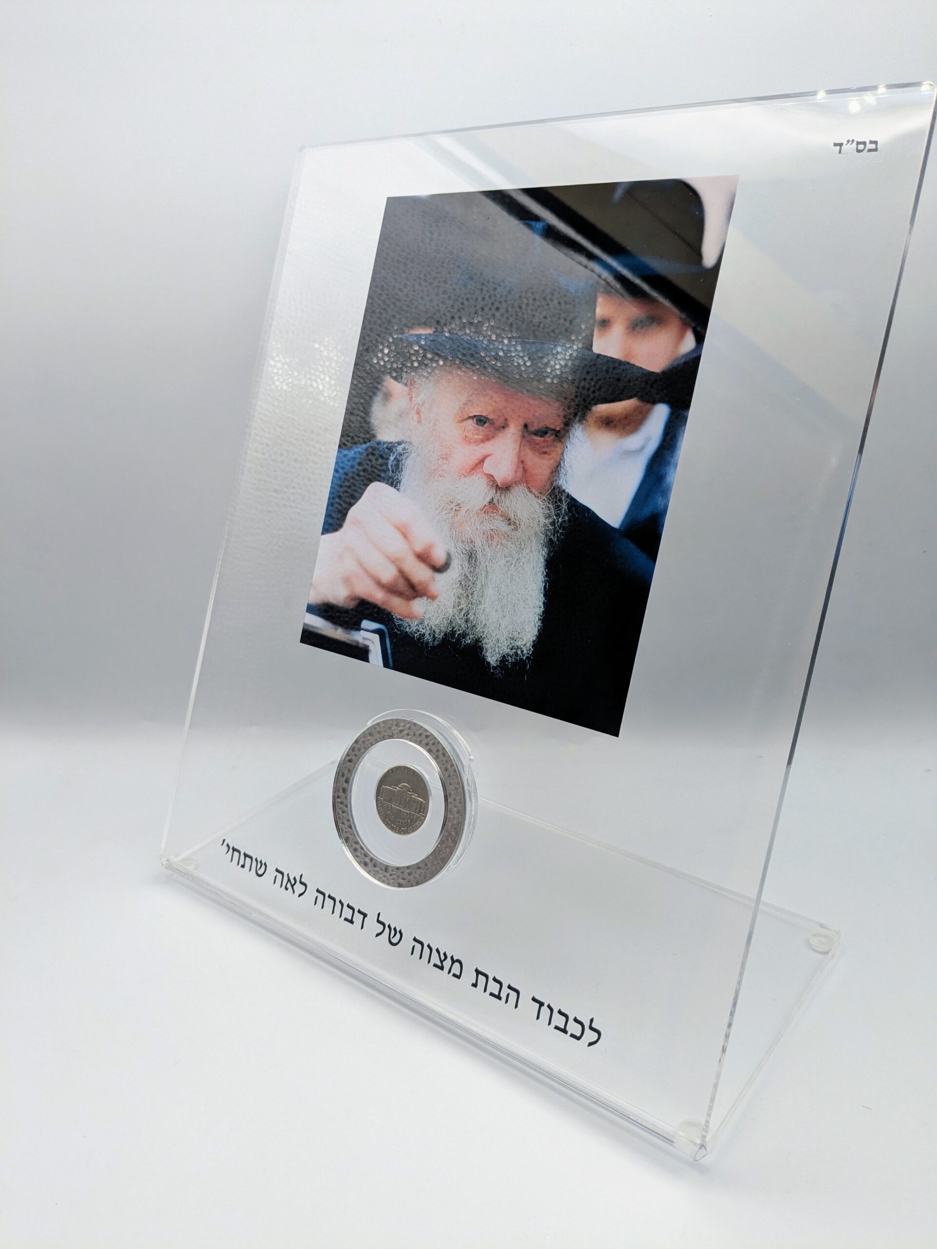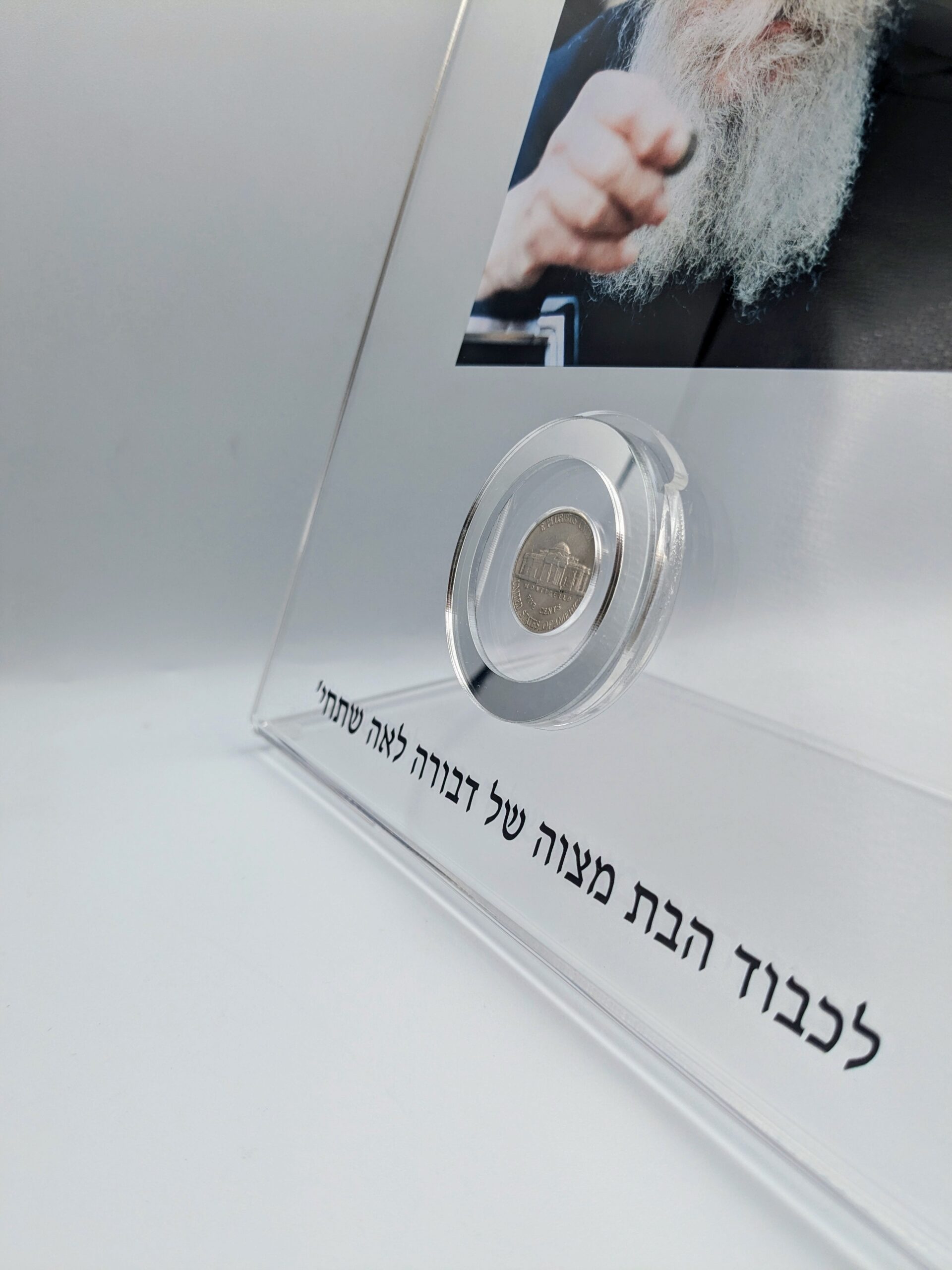 Honor a meaningful moment with this elegant Rebbe coin display, crafted to preserve and showcase a special coin received from the Lubavitcher Rebbe. Featuring a high-resolution photo of the Rebbe giving a coin, this stand captures the essence of connection, inspiration, and blessing.