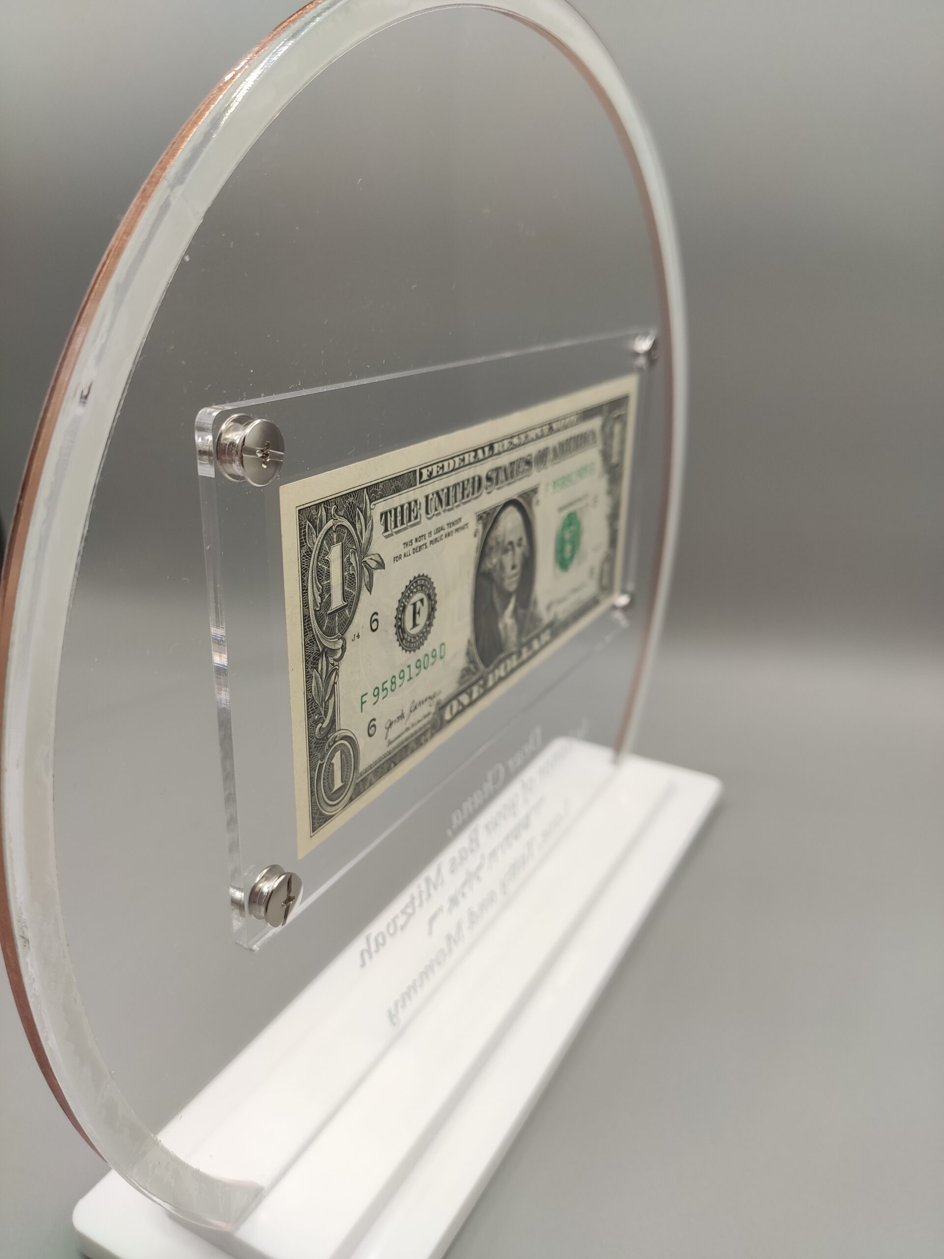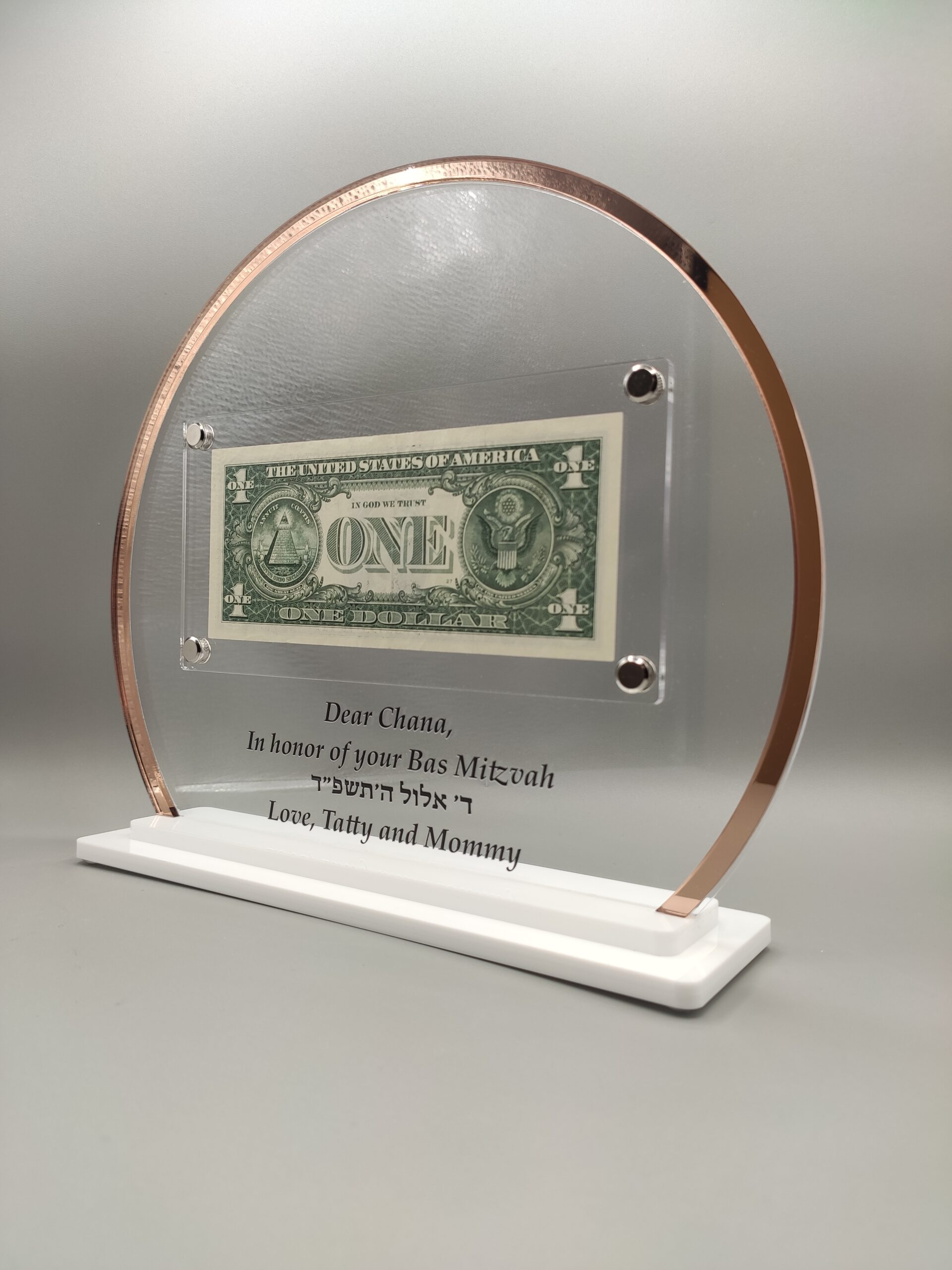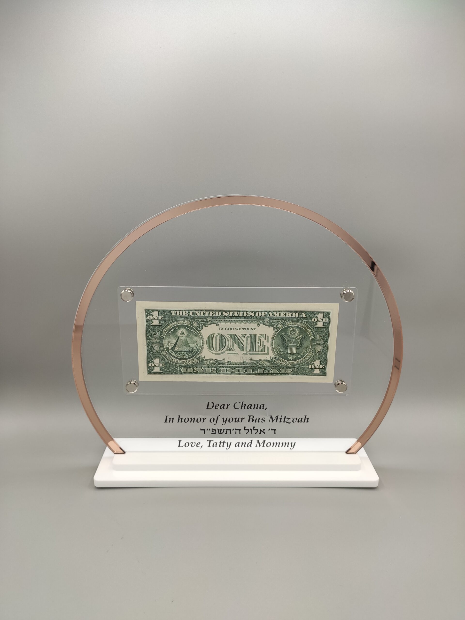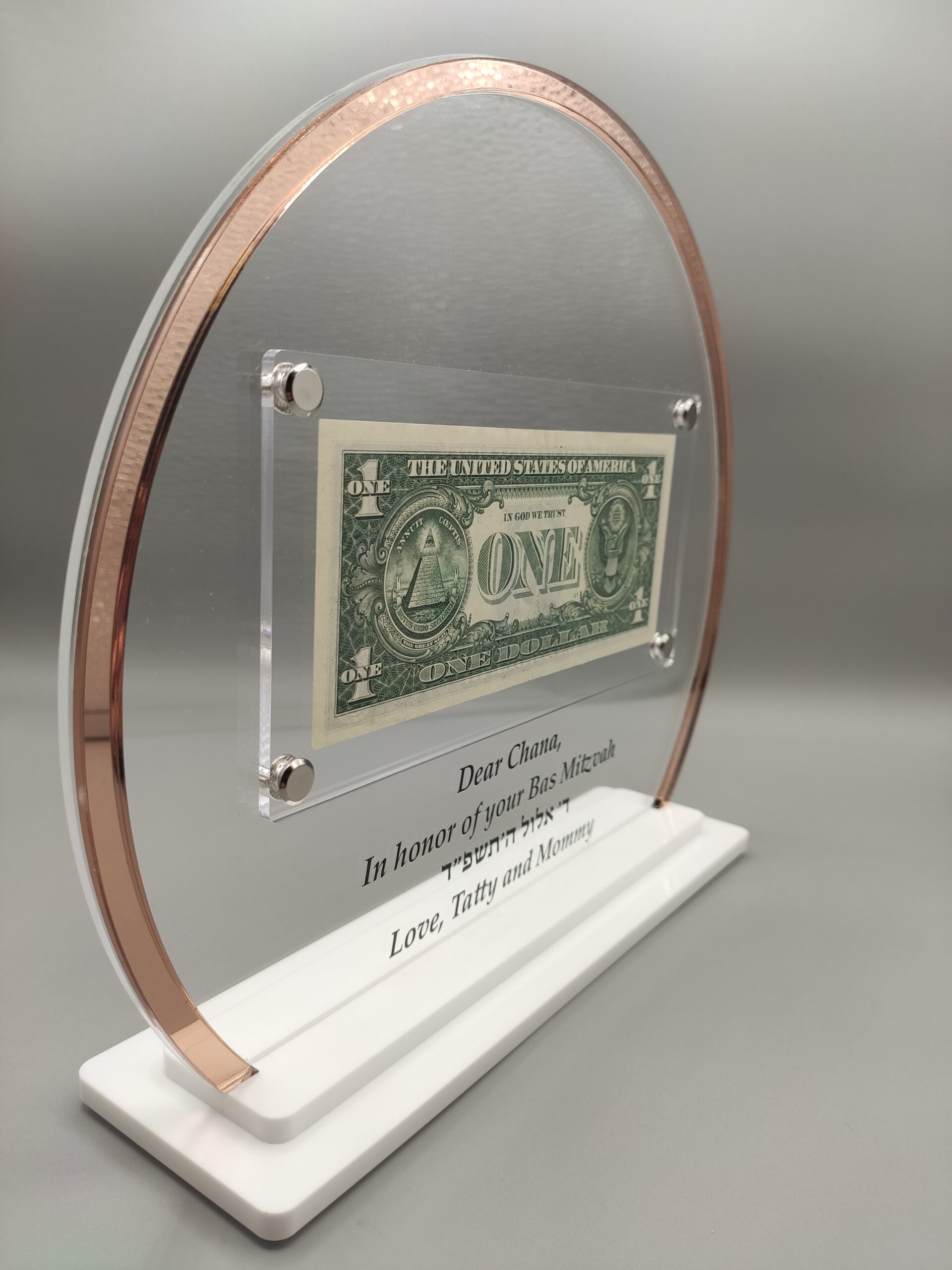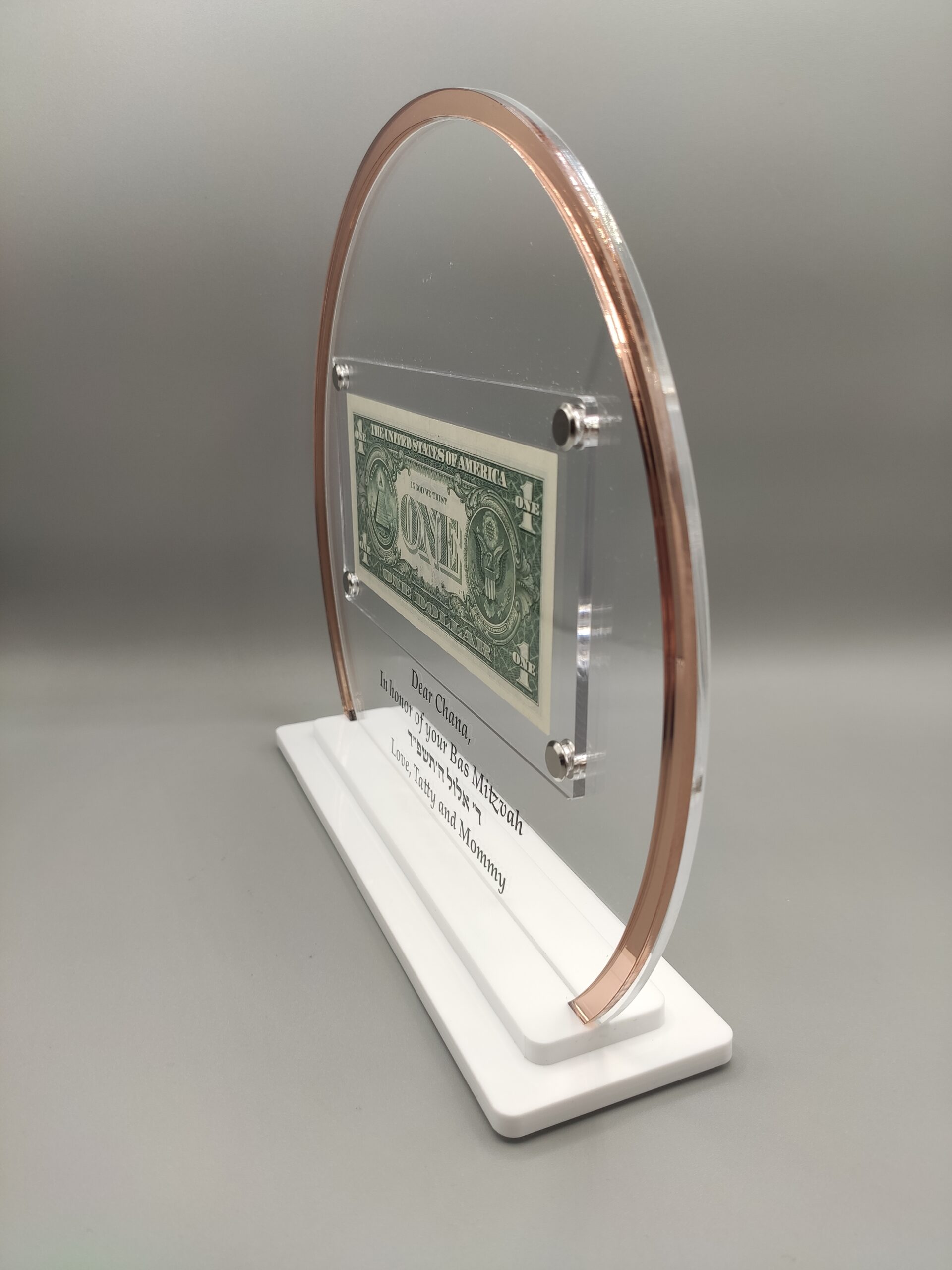 Showcase your Rebbe Dollar with elegance using this Personalized Rebbe Dollar Display. Designed with a round clear acrylic frame featuring a chic rose gold mirror edge, this display combines modern style with traditional significance.