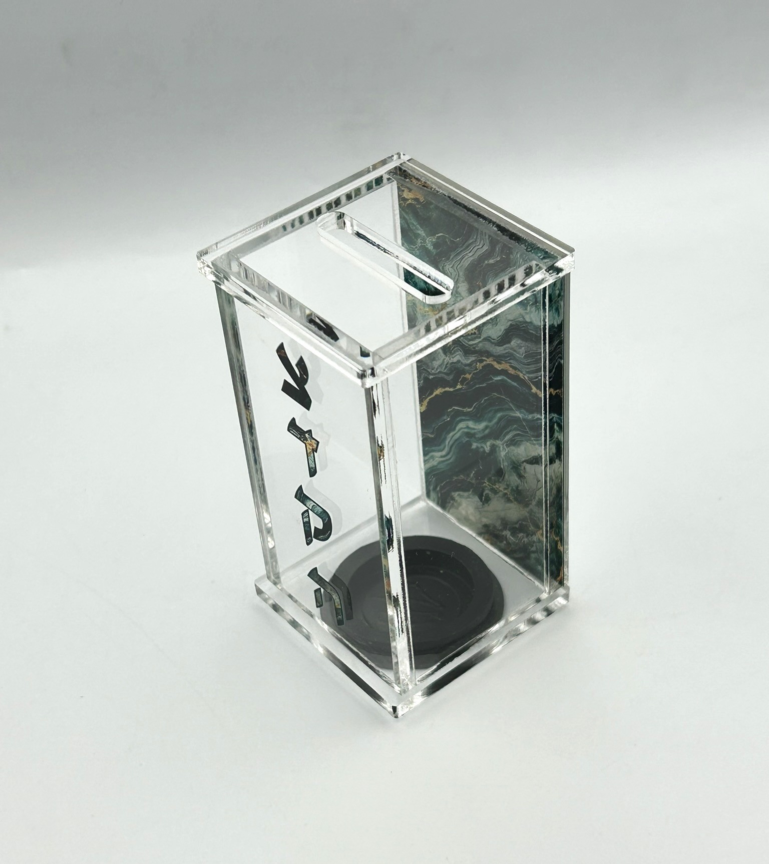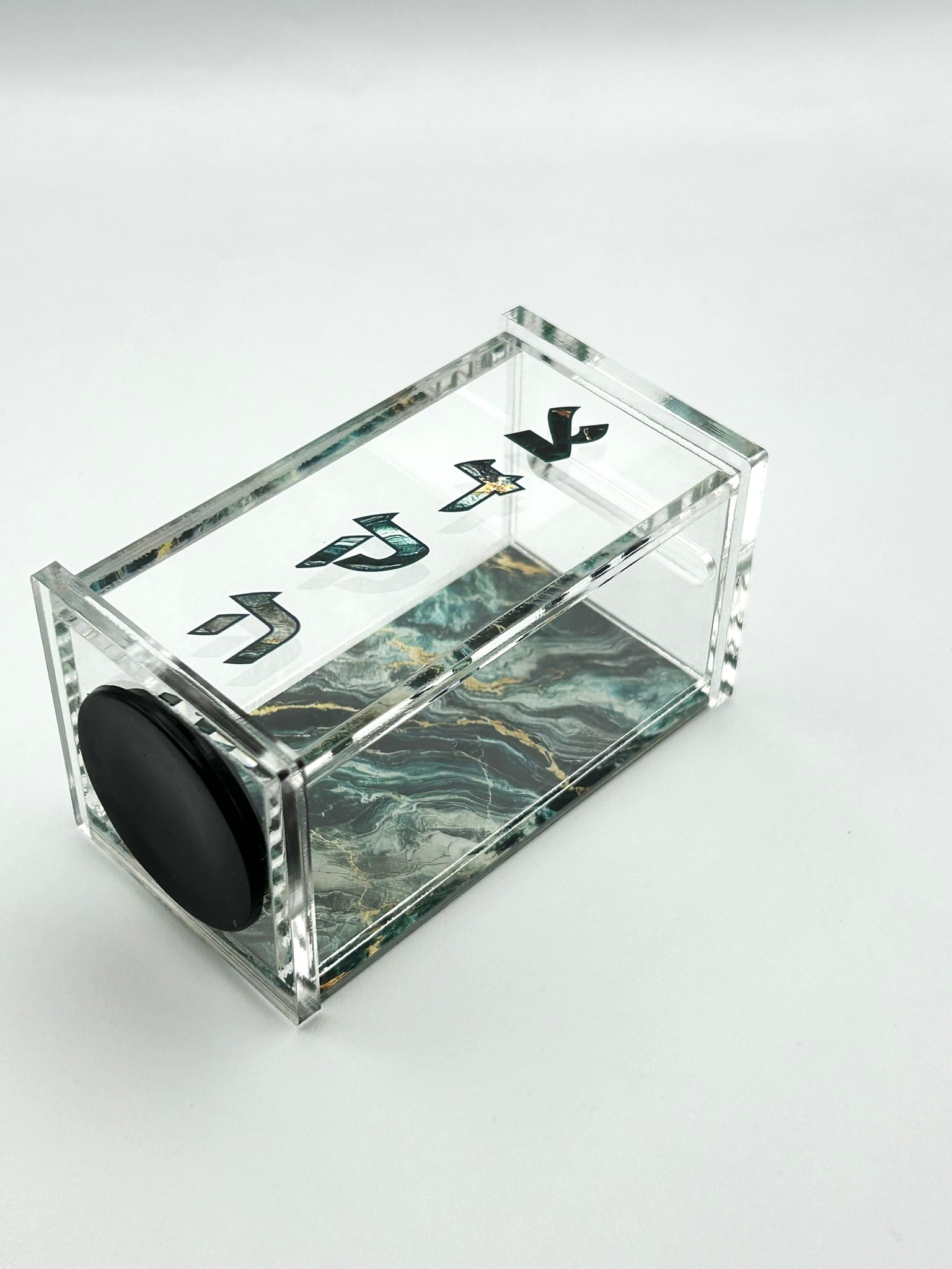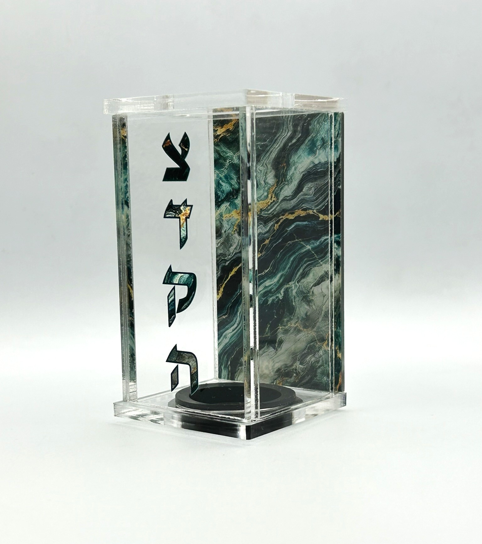 Crafted from high-quality clear plexiglass, it features a mirror back panel and a rich marble-style print with touches of gold for a refined, modern look. The Hebrew word “צדקה” (Tzedaka) is beautifully printed on the front.